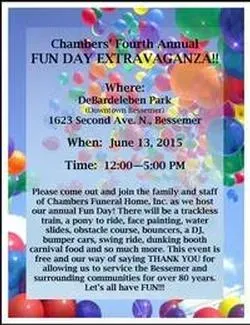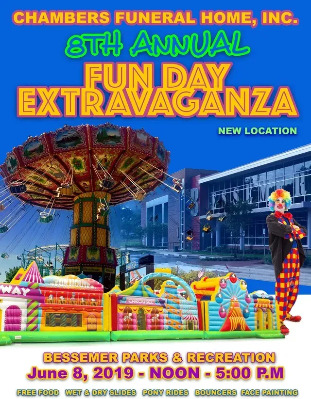 Please come out and join us for our 8th Annual Fun Day Extravaganza. This year Fun Day will be held Saturday, June 8, from 12-5:00 P.M. at the Bessemer Parks & Recreation Center located at 100 14th Street South Hwy 150. This is a FREE event that will have bounce houses, water slides, horse and pony, popcorn and so much more!